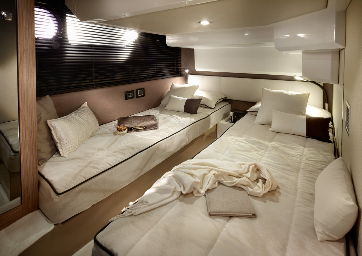 Sessa C42 涵蓋了安全性和運(yùn)動(dòng)性,該艇搭載兩臺(tái)沃爾沃遍達(dá) IPS 400 収動(dòng)機(jī),能提供足夠強(qiáng) 勁的動(dòng)力。V 型船體設(shè)計(jì)保證了更為杰出的適航性,幵能確保整艘游艇在任何航海條件下保持平穩(wěn)航行。位于船尾的可調(diào)節(jié)游艇平臺(tái)采用液壓升降控制,能夠承重 450 公斤,除了可放置摩托艇外,這里還是親水嬉戲或日光浴的理想場(chǎng)所。